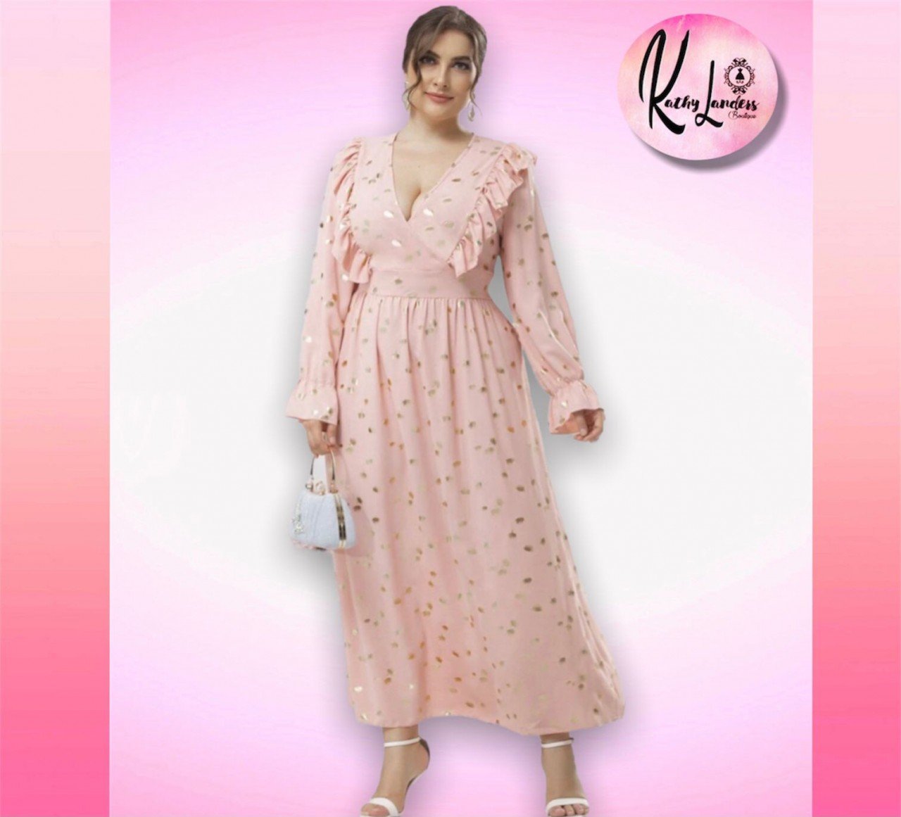 MAXYVESTIDO ROSA CON DETALLES DORADOS, CUELLO EN V CON VOLANTE, DE MANGA LARGA Y AJUSTE EN MUÑECAS